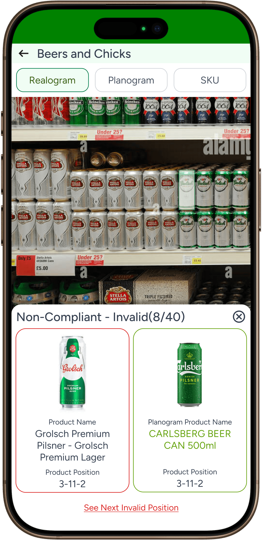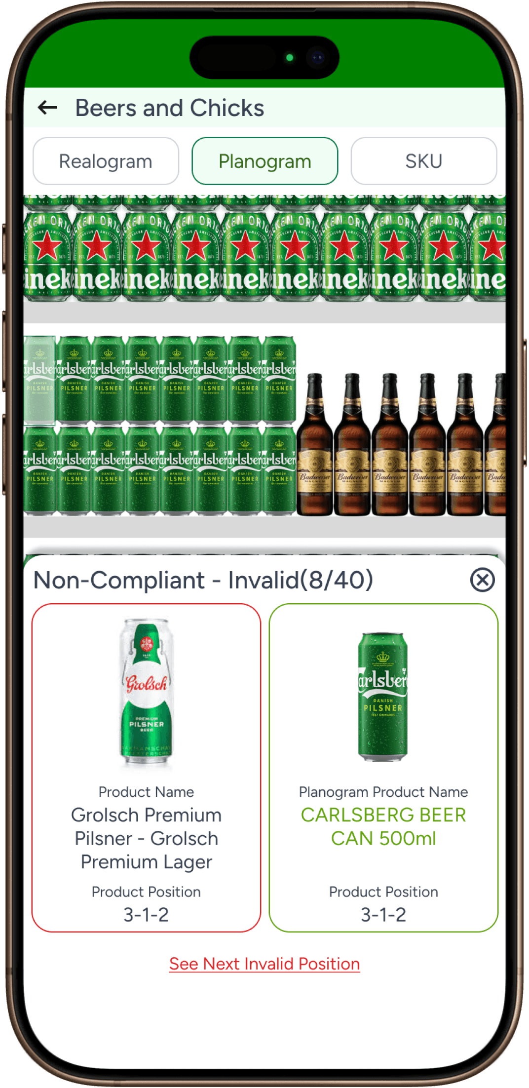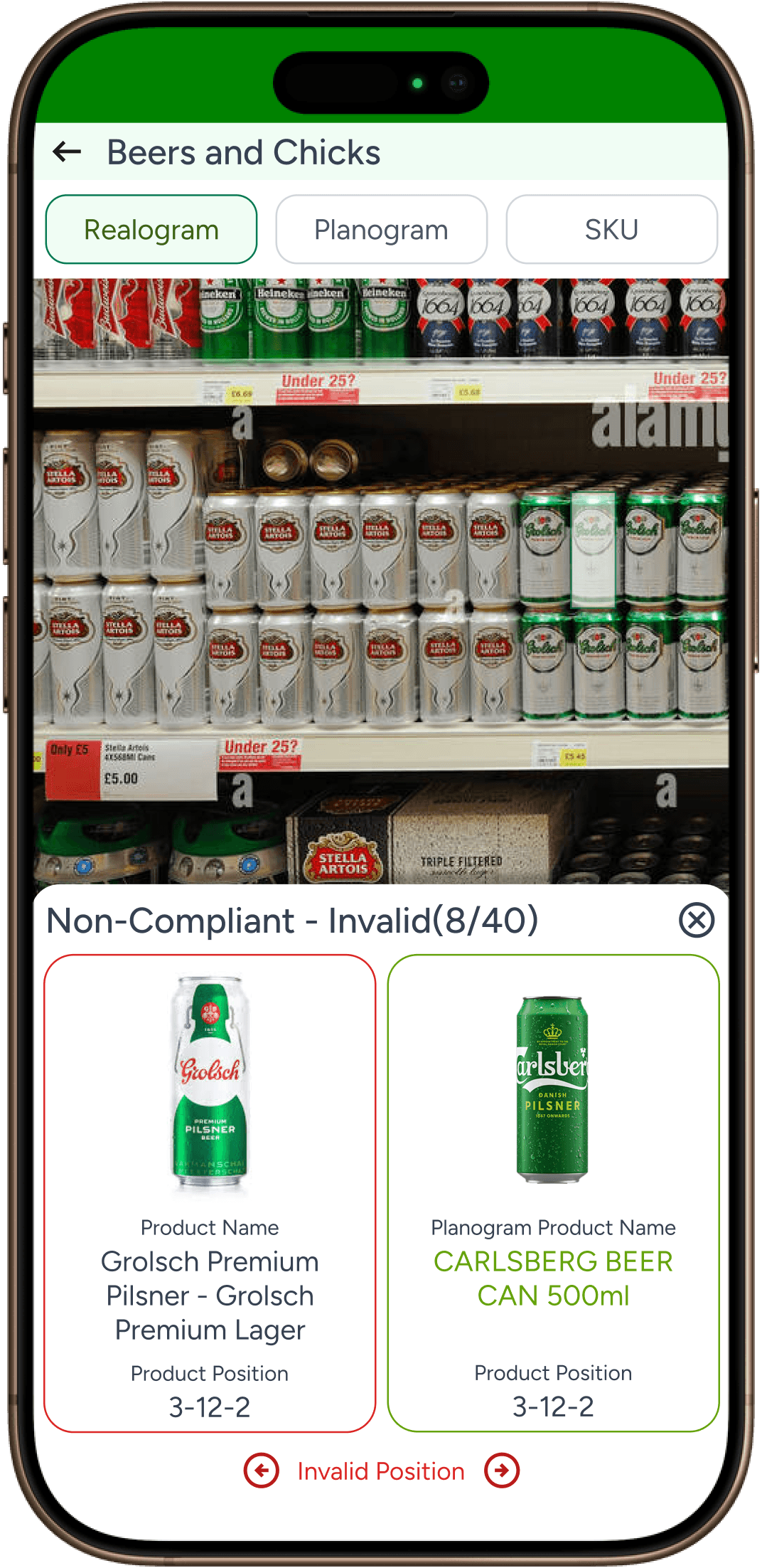 User taps on close button in previous screen and clicks on Invalid, they can see all Invalid SKUs. User can tap on SKU to see the planogram compliance details.
