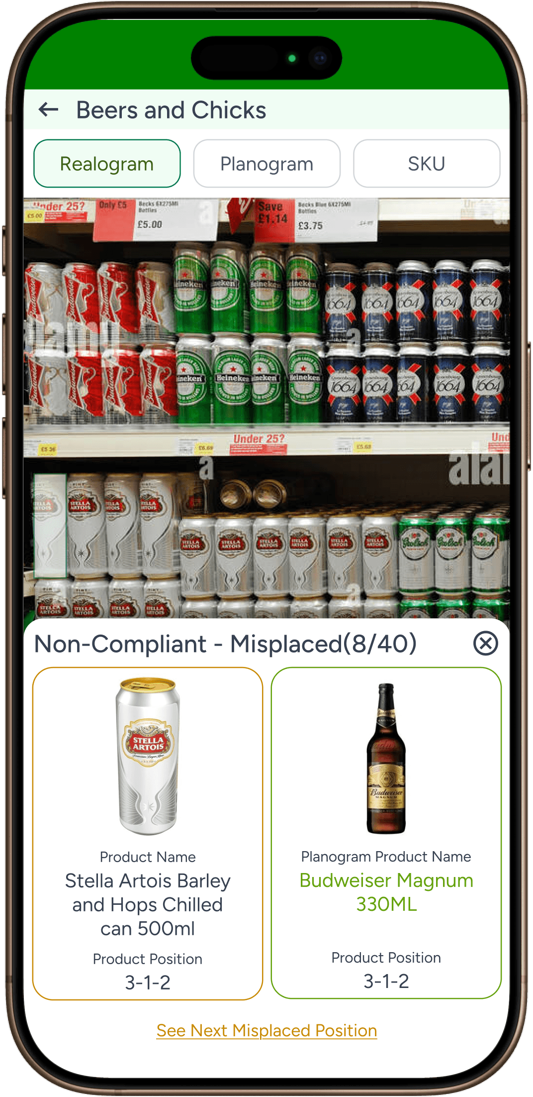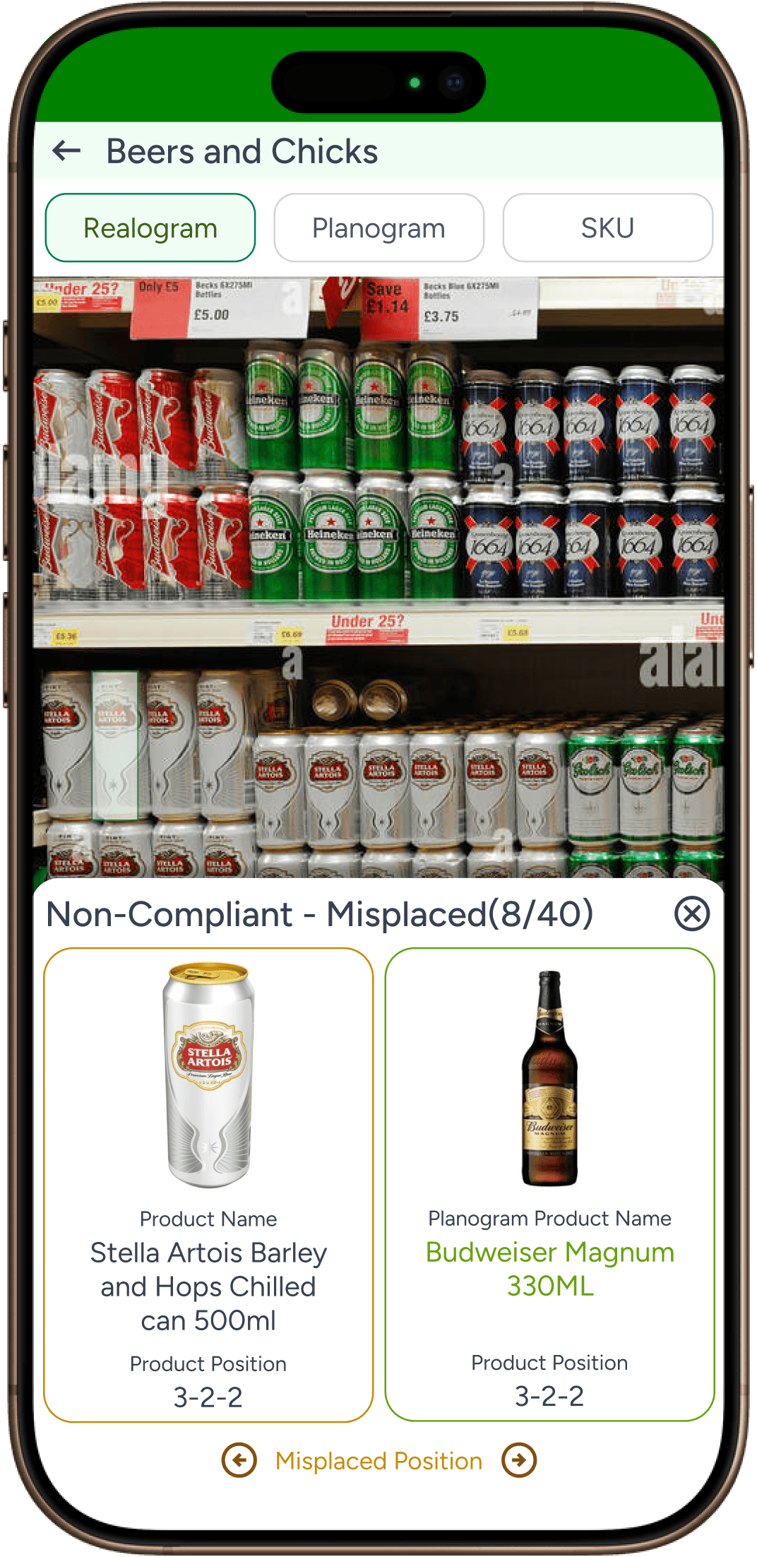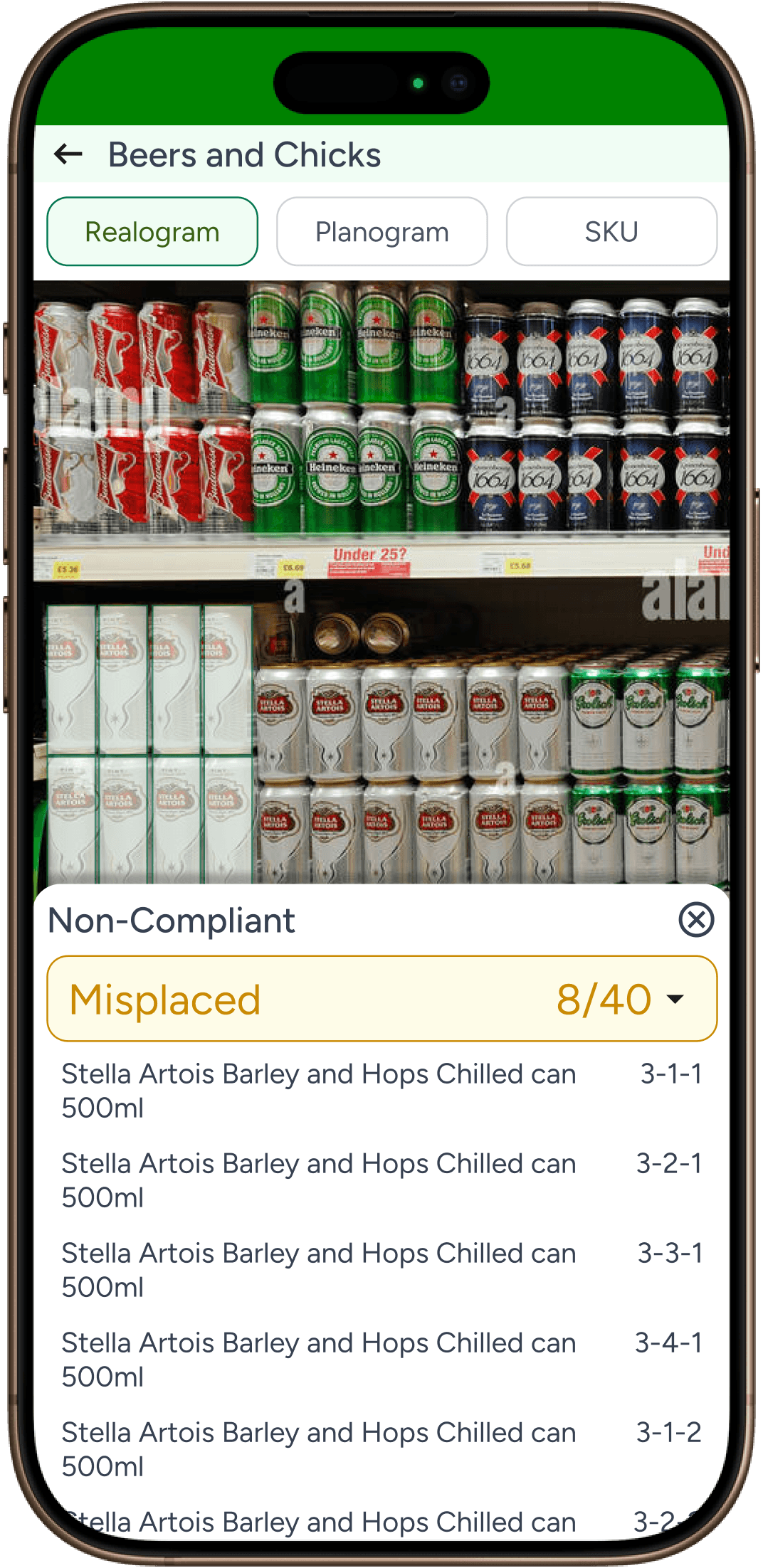 User taps on close button in previous screen and clicks on Misplaced, they can see all misplaced SKUs. User can tap on SKU to see the planogram compliance details.